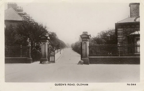 View showing the lodge, pillars, gates and entrances to the Park and Queens Road