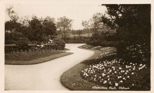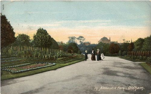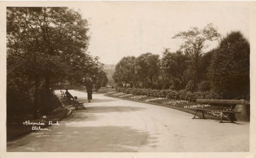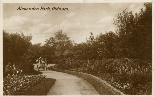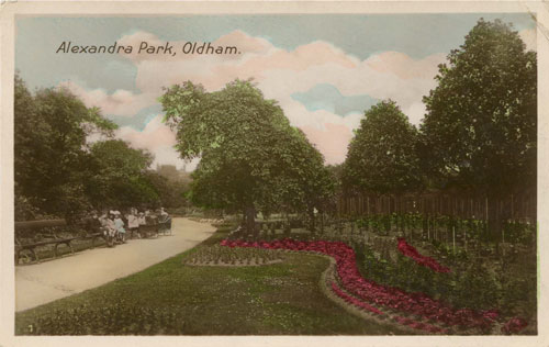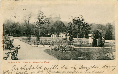 Hope by this reaches you, the weather will be more favourable, as it will be very awkward if the grass is damp. Am sending a view of the Park to awake memories of good times spect thereon & hoping you will have better & more thrilling whilst at Morecambe. Jim and I are being quite good boys now all the noise has departed, we are getting quite angelic - Trusting you are well & have not caught cold with staying out late - 10pm. latest.