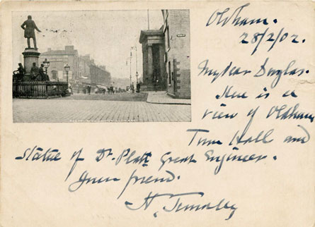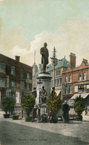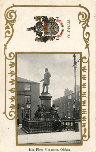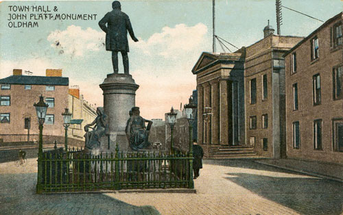 The first postcard below shows John Platts Statue in Alexandra Park, whilst the following four postcards show the earlier position in the vicinity the Town Hall.