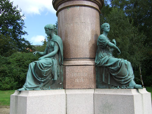 The bronze statue of John Platt by Sculptor David Watson Stevenson together with the circular pedestal, the work of McDonald and Field of Aberdeen both sit on a rectangular stone structured base flanked by four symbolic seated females representing Engineering, Manufacturing, Science and Art.
