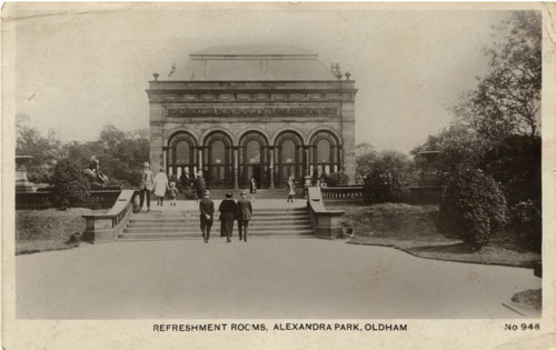 The Refreshment Rooms, an imposing building, situated on the Terrace facing the Promenade, the design though not fully appreciated by some at the time. It can be seen in the distance on many of the postcards of the park, particularly those of the Promenade